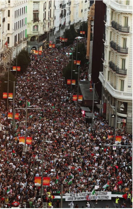 El 14 de septiembre, el centro de Madrid amaneció blindado por la presencia de 2.300 policías, con sus tanquetas, sus porras, escudos y material antidisturbios. Sin embargo, no pudieron hacer nada por impedir que 100.000 personas, blandiendo banderas palestinas, tomáramos el centro, saltáramos las vallas e invadiéramos las calles. “Esta vuelta la gana Palestina” o “Israel asesina, Europa patrocina” resonó por la ciudad.