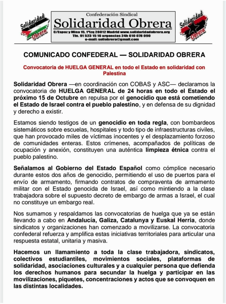 Por último, el 15 de octubre se ha convocado una huelga general para demandar un alto el fuego permanente, el fin de la venta de armas a Israel, la ruptura de relaciones económicas, comerciales o de cualquier otra índole con el ente sionista, el fin de la ocupación de Gaza y Cisjordania y el respeto a los derechos humanos. Mientras que algunos sindicatos como CCOO y UGT han convocado paros de dos horas a las 10:00, a las 17:00 y a las 02:00, otros como Solidaridad Obrera, COBAS, ACS, CGT y Confederación Intersindical lo han hecho con una duración de 24 horas, por lo que cualquiera se puede sumar durante toda la jornada.