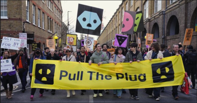Hace un par de semanas participé en la Marcha contra las Máquinas en Londres, organizada por el grupo Pull the Plug, cuyo nombre es igualmente contundente. Los oradores que se congregaron frente a las oficinas de los gigantes de la IA en King’s Cross abordaron temas que iban desde la explotación laboral, el «riesgo existencial», el impacto ambiental, la vigilancia, el control corporativo y la represión estatal, hasta la forma en que la IA está destruyendo la educación.